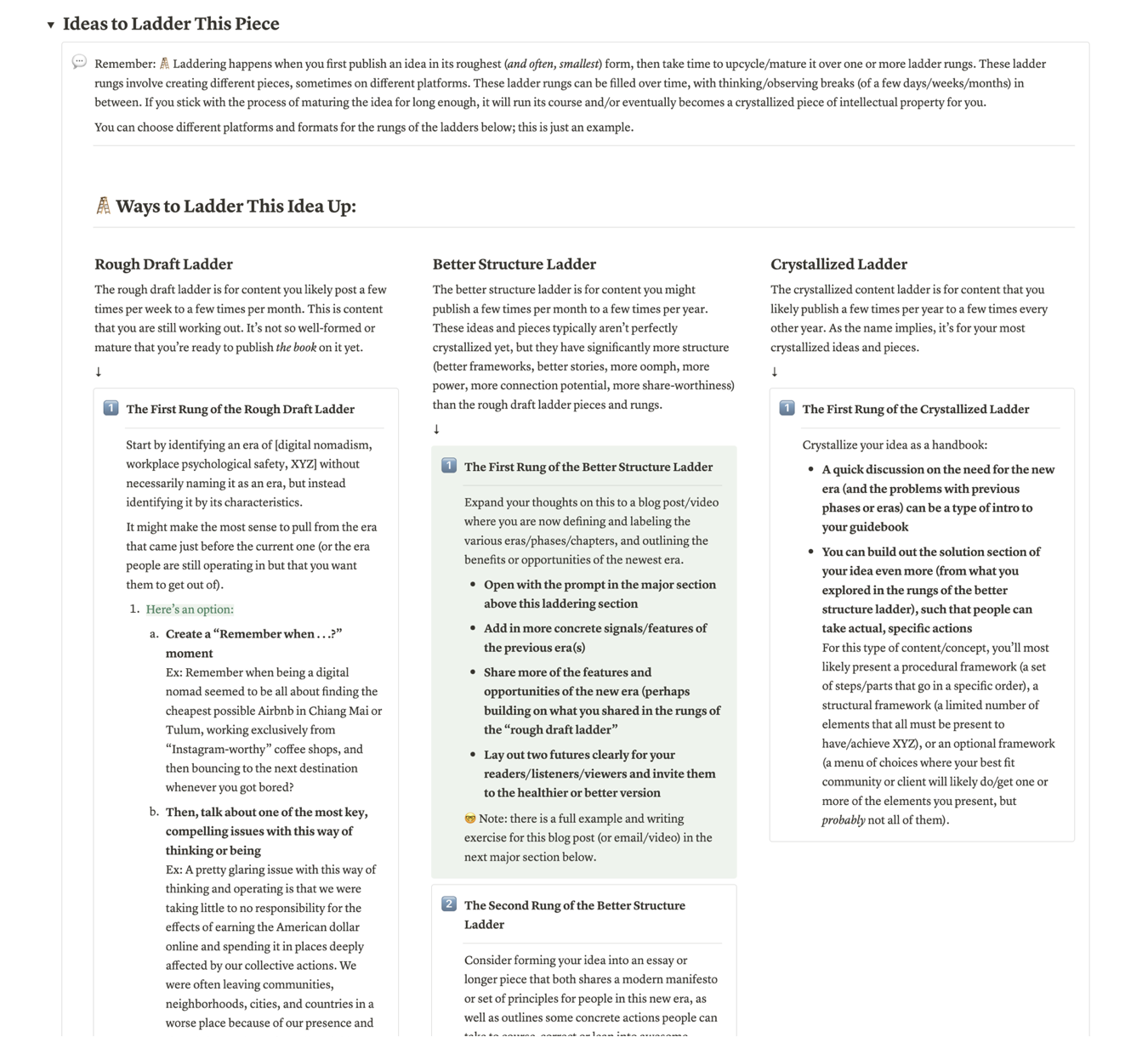 P.S. 🪜 Laddering is when you publish an idea in its roughest form, then take time to upcycle/mature it over one or more ladder rungs into new pieces. If you stick with the idea long enough, it eventually becomes a crystallized piece of intellectual property for you.