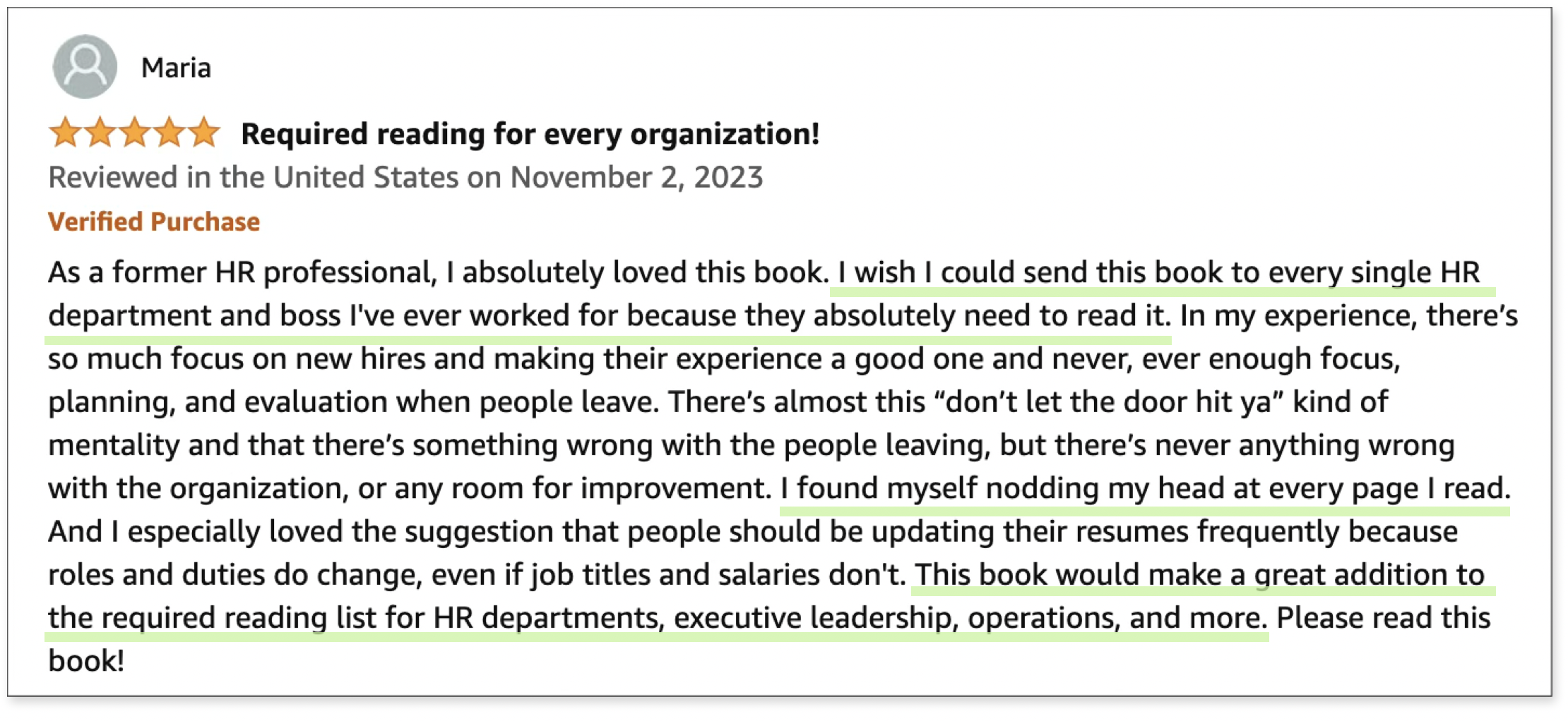 “This book would make a great addition to the required reading list for HR departments, executive leadership, operations, and more. Please read this book!”
